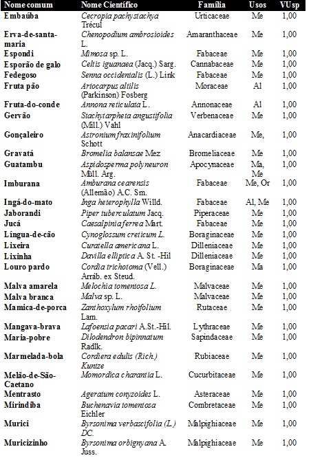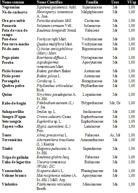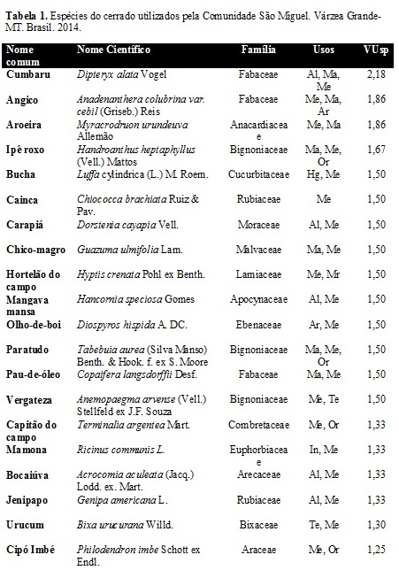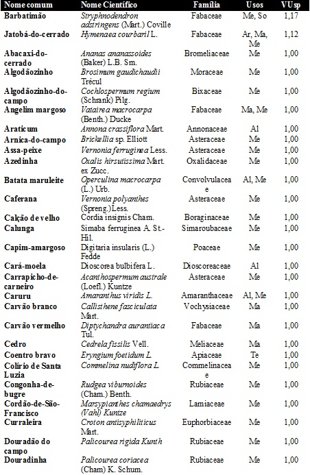 O presente estudo teve como objetivo identificar as espécies de plantas nativas mais importantes para essa comunidade, analisar a diversidade de uso e a diversidade de plantas, e relacionar o valor de uso com a disponibilidade das plantas no ambiente.  Adotaram-se as técnicas de entrevistas semiestruturadas. No levantamento etnobotânico, foram catalogadas 67 espécies distribuídas em 30 famílias botânicas. As espécies mais importantes para a comunidade, conforme o valor de uso, foram cumbaru, angico e aroeira. Estudos com plantas nativas podem gerar alternativas eficazes que diminuam o impacto da coleta sobre as populações naturais.