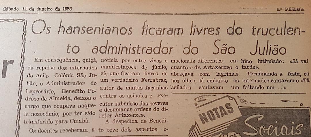 OS HANSENIANOS ficaram livres do truculento administrador do São Julião. Jornal Correio do Estado, Campo Grande, 1958.